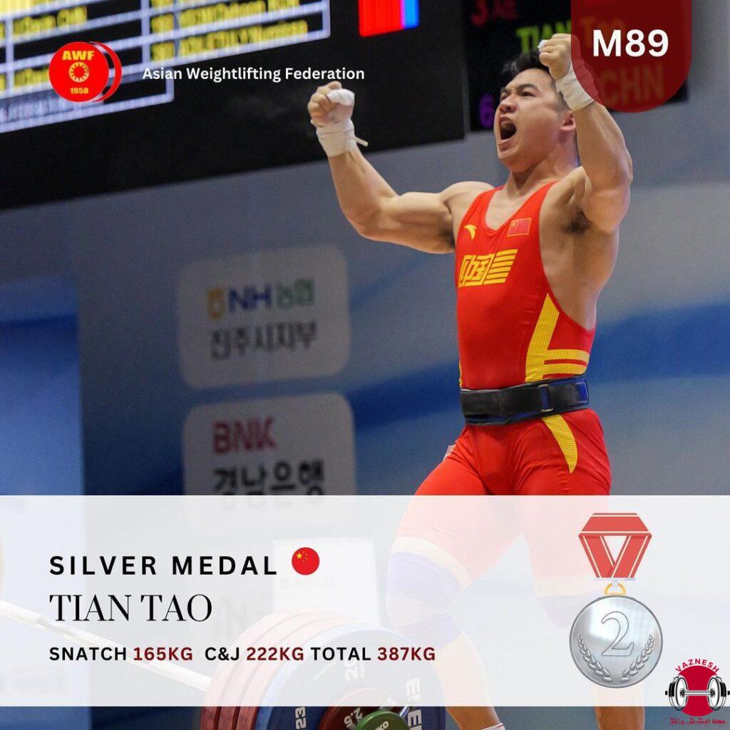 - نفره دوم – تائو تیان از چین با رکورد 165 کیلو یکضرب – 222 کیلو دوضرب – 387 کیلو مجموع