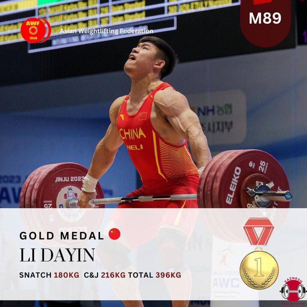 در یکضرب رقابتهای دسته ۸۹ کیلوگرم لی دایین با مهار وزنه ۱۸۰ کیلوگرمی به مدال طلا رسید. لی دایین در حرکت دوم یکضرب با مهار وزنه ۱۷۶ کیلوگرم رکورد آسیا در این دسته به نام خود ثبت کرد و در ادامه موفق شد وزنه ۱۸۰ کیلوگرمی را مهار کند تا رکورددار جهان در دسته ۸۹ کیلوگرم لقب گیرد. رکوردشکنی لی دایین در حالی بود که کیانوش رستمی و تیان تائو چینی دارندگان مدال جهان و المپیک در این دسته حضور داشتند.