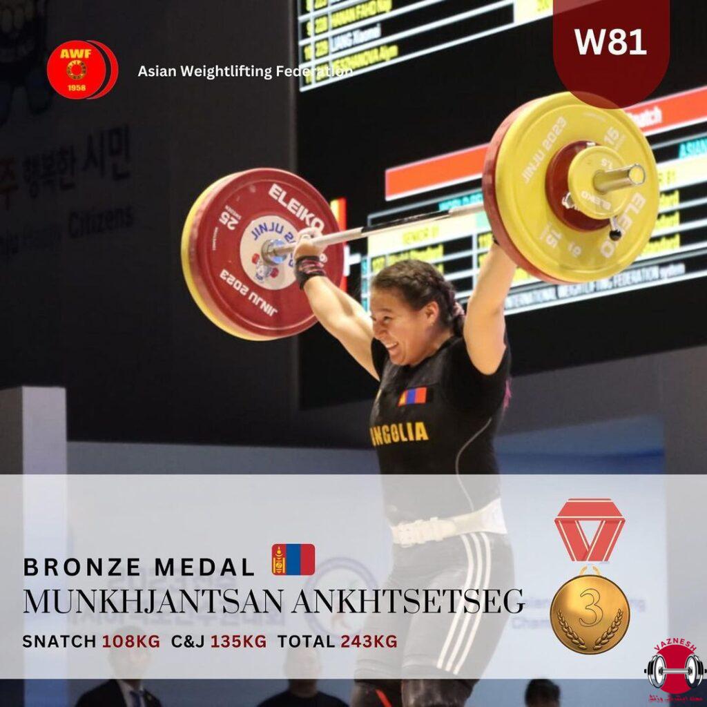 - نفر سوم – مونخجان سان از مغولستان با رکورد 108 کیلو یکضرب – 135 کیلو دوضرب – 243 کیلو مجموع