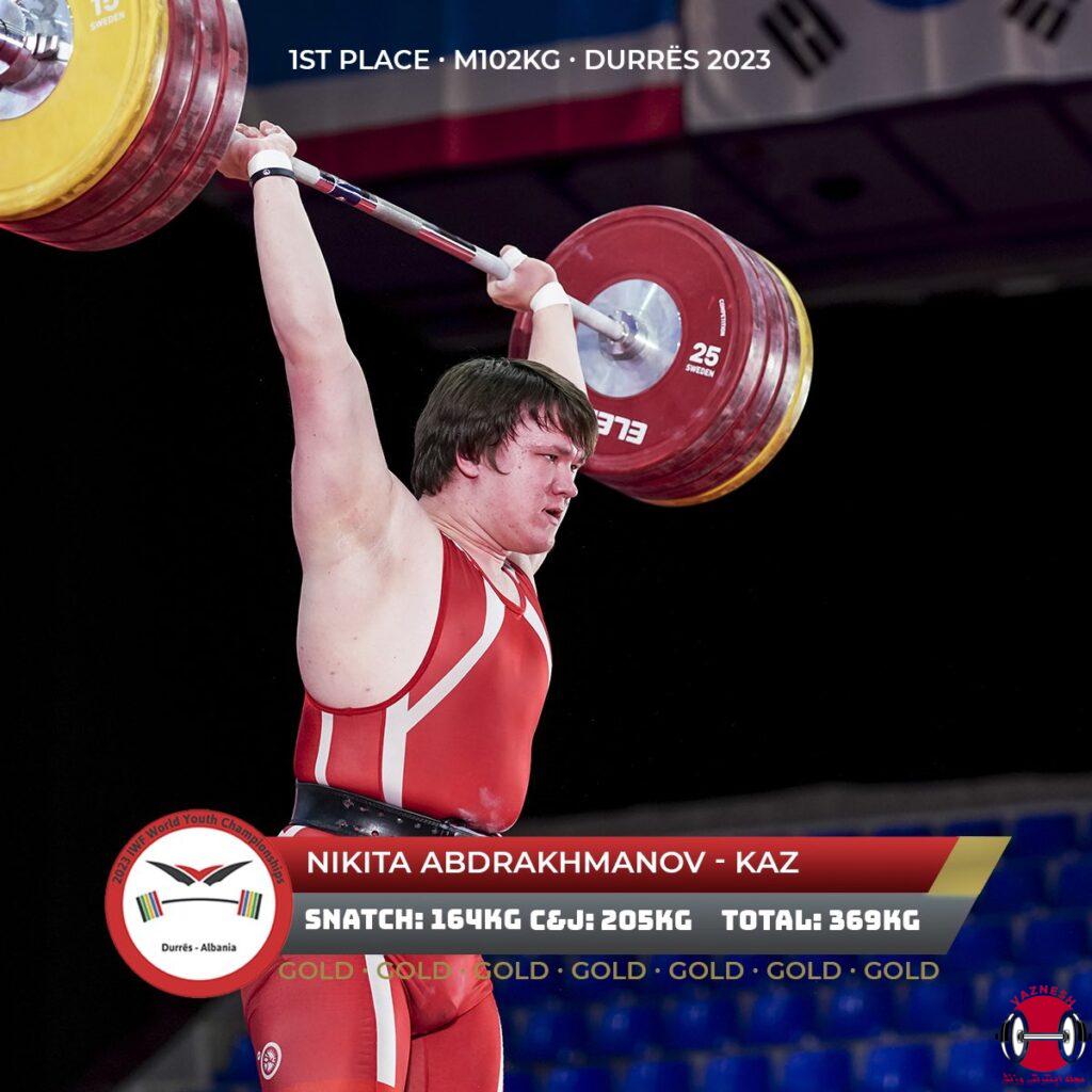 - نفر اول نیکیتا عبدالرحمانوف از قزاقستان با رکورد مجموع 369 کیلوگرم (164 + 205)